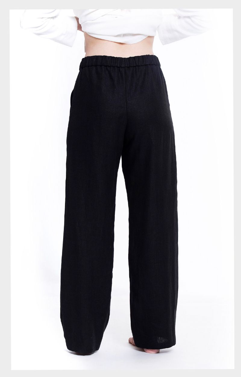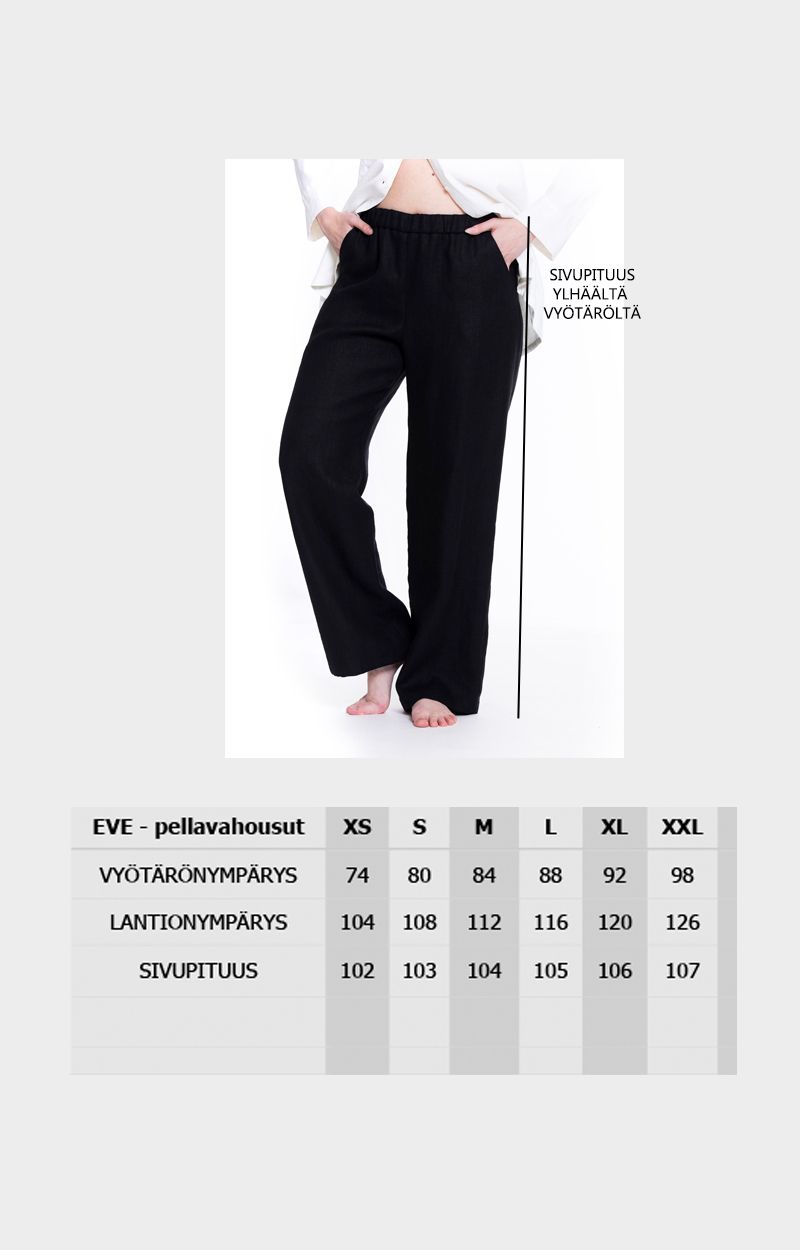 EVE-pellavahousut ovat tyylikkäät, joka tilanteeseen sopivat käyttöhousut. Housuissa on leveät lahkeet ja korkea vyötärö. Vyötärön kuminauhan ansiosta housut eivät kiristä, vaan ovat mukavat päällä. Housuissa on reilun kokoiset taskut.