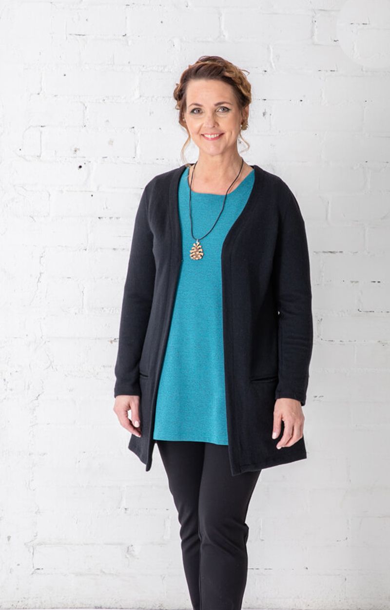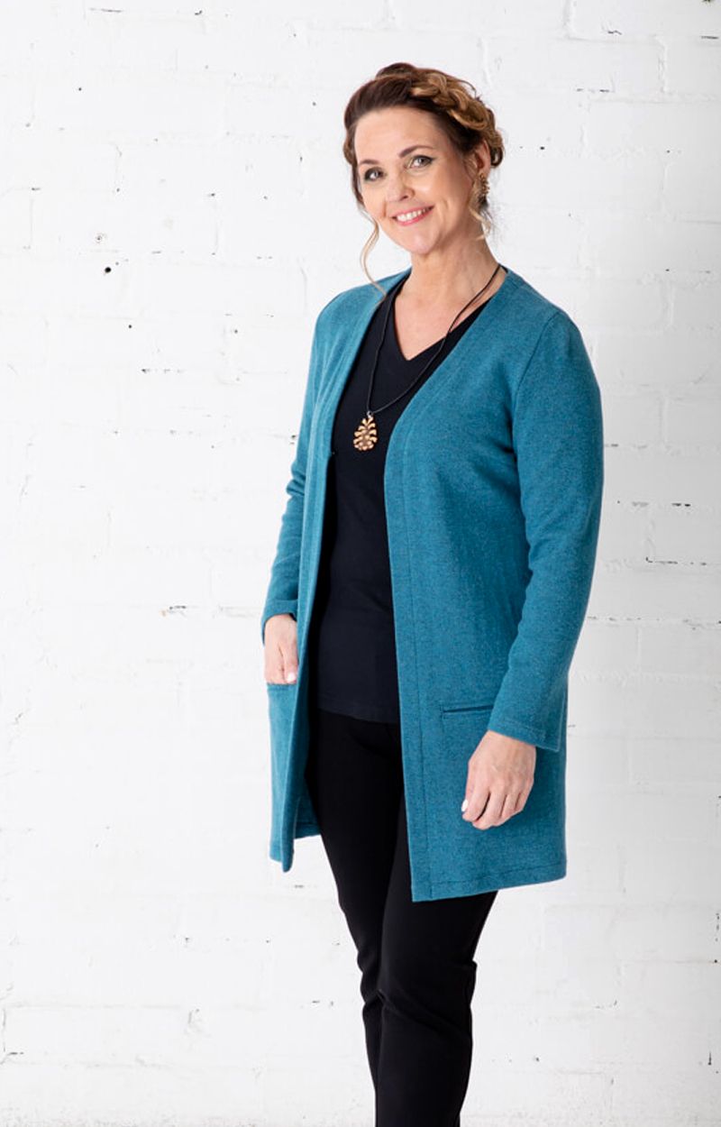 Tilattavissa koot XS – XL. Jos kaipaat lyhyempää merinovilla neuletakkia, tutustu napilliseen ISABELLA-neuletakkiin.