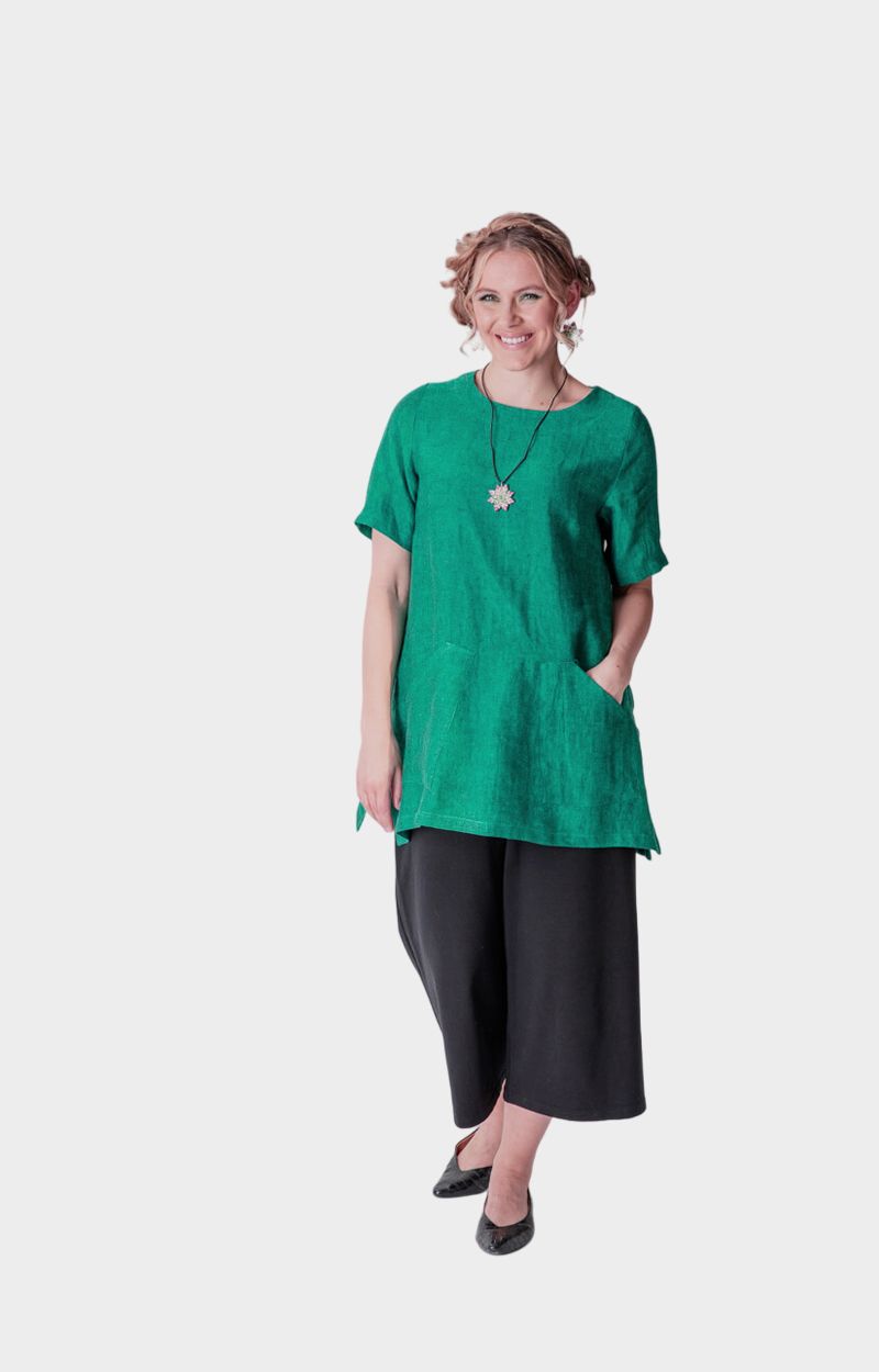 Lyhythihainen VILJA-pellavatunika on malliltaan rento. Tunika on ylhäältä olalta istuva ja rintamuotolaskoksen alapuolelta se alkaa levenemään helmaa kohden. Tunikassa on mukavan isot taskut, jotka tuovat arkeen käytännöllisyyttä, kun tavarat kulkevat helposti mukana menoissa. Tunikan helmassa on halkiot, jotka kauniisti keventävät tunikan ilmettä.
