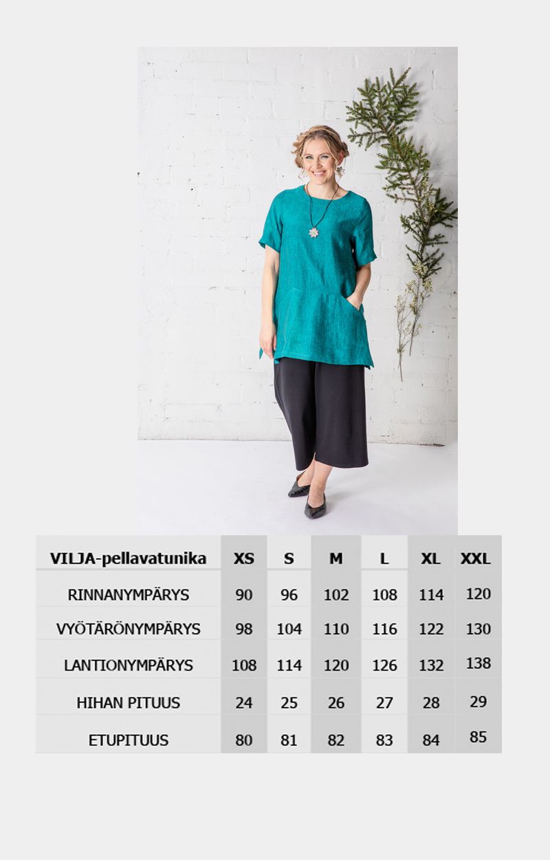 VILJA-pellavatunikan materiaali on Ökö-Tex 100 -laatua olevaa 100% pellavaa, joka on valmistettu Italiassa. Kangas on esipesty Marseille-saippualla täysin ilman kemikaaleja, joten ei myöskään kutistu.