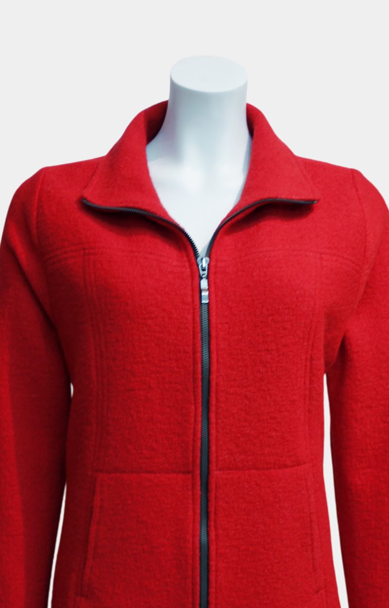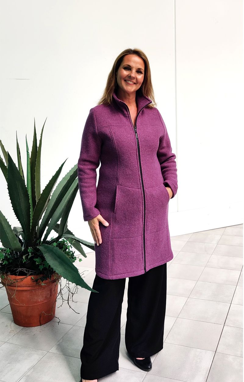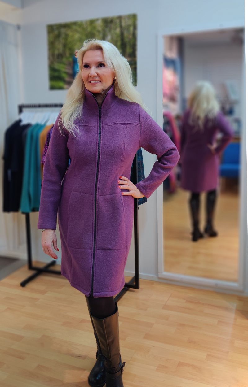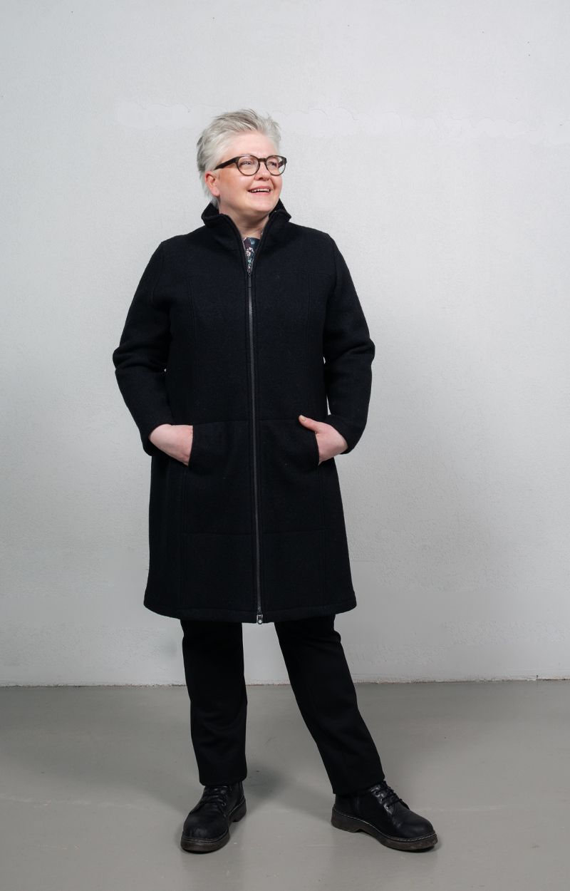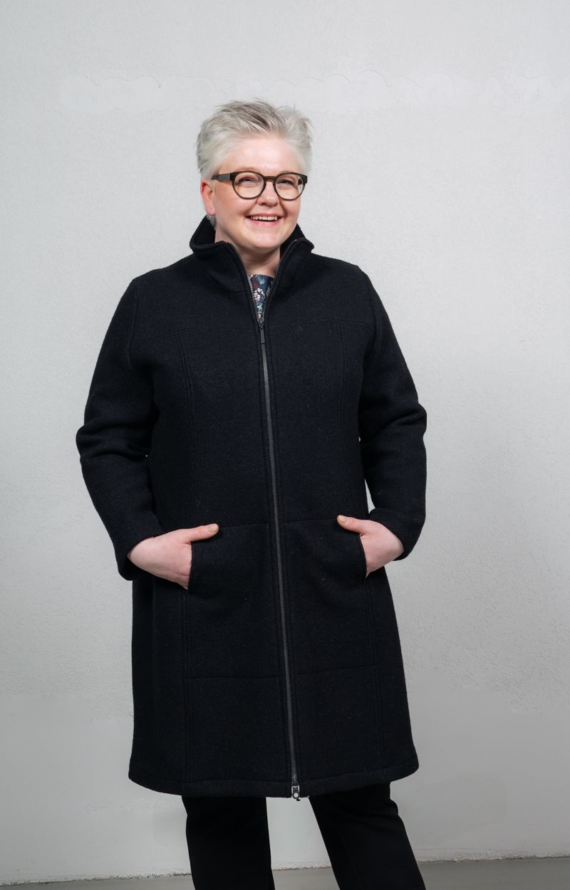 ”Minulla on punainen ADELE pyöreällä pääntiellä. Ihana vaate! Voisinko tilata muutoin samanlaisen takin paitsi tummansinisenä ja korkealla kauluksella? Kyllä on mieluinen ja mainio näillä keleillä, kun joutuu kulkemaan sadetta pitävässä takissa, niin villa lämmittää ihanasti välissä. Ja silti on sitten pukeissa. :)” – Helena