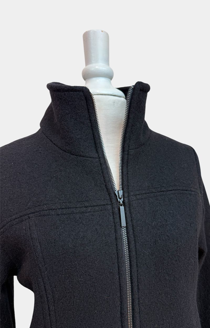 Olen suunnitellut takin tyylikkään rennoksi, unohtamatta käyttömukavuutta. Takissa on pitkä musta kaksilukkovetoketju, jonka voi kätevästi avata ylhäältä ja alhaalta. Vetoketjussa on kauniina yksityiskohtana korumaisen tyylikkäät vetimet.